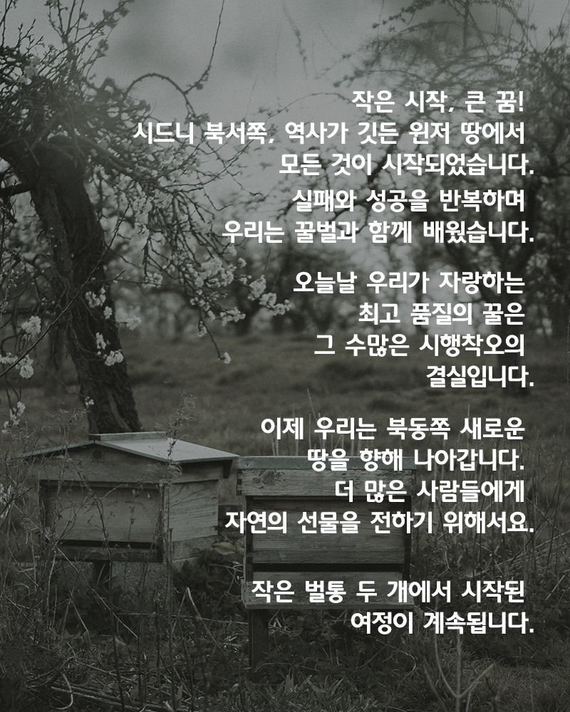 시드니 북서쪽, 역사가 깃든 윈저 땅에서 모든 것이 시작되었습니다. 두 개의 작은 벌통과 함께한 첫걸음이었죠.