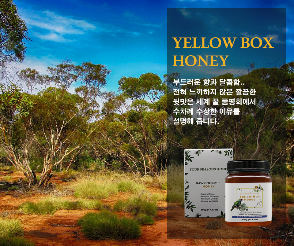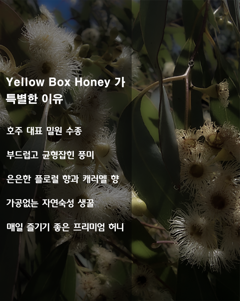 Yellow Box Honey 는 유칼립투스 멜리오도라(호주산 유칼립투스 나무의 일종) 라는 호주 아웃백에서 자생하는 토착종에서 채집되는 전형적인 천연 생꿀로서 버터같이 부드럽고 달콤한 프리미엄 꿀입니다.  빅토리아 북부에서 뉴사우스웨일스를 거쳐 퀸즐랜드 남동부까지 뻗어 있는 그레이트 디바이딩 산맥의 고원과 서쪽 경사면의 풀이 우거진 삼림 지대에서 일년 중 짧은 기간 동안만 꽃을 피우는 시기에 수확되어 더욱 특별합니다.  이 지역은 이슬이 더 많이 맺혀 상급 등급의 바삭바삭하고 맑은 향이 나는 꿀을 생산합니다.