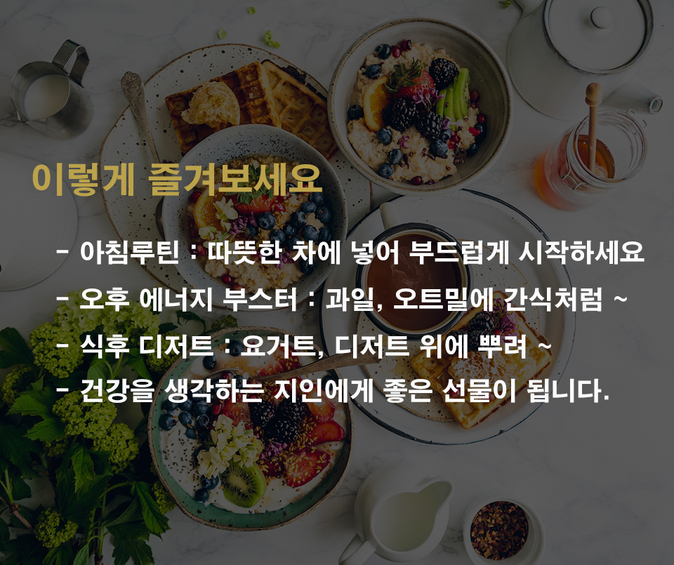 - 진져허니는 달콤하며 매콤한 맛이 특징으로 면역력을 강화하는 천연 에너지 공급원입니다.